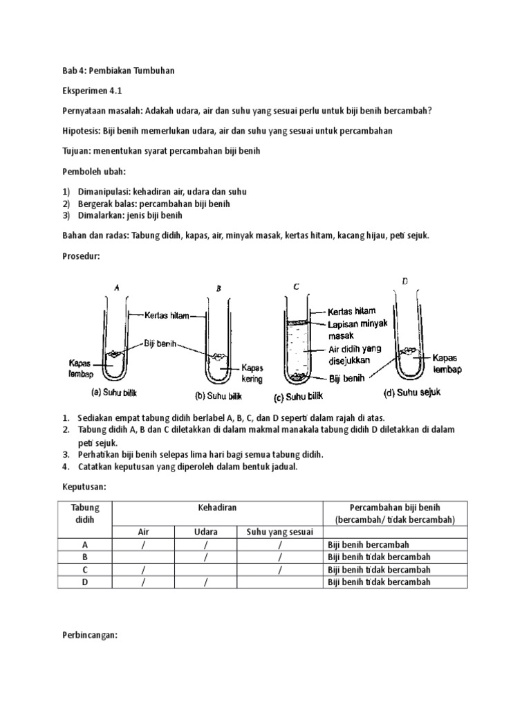 Eksperimen 4 percambahan biji benih. Perkecambahan pada biji tanaman diawali dulu dengan biji dormancy ( berhenti aktivitas). Perkecambahan atau germinasi (bahasa inggris: Perkecambahan adalah proses tumbuhnya embrio yang tadinya dalam keadaan istirahat dan diikuti oleh robeknya kulit biji. Perkecambahan adalah berakhirnya masa dormansi biji hingga tumbuh jadi tumbuhan baru.