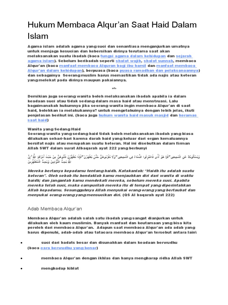 Semoga wanita muslimah dapat tercerahkan. Haid itu mempunyai banyak konsekuensi hukum lebih dari 20 hukum, kami sebutkan sebagiannya yang menurut kami banyak dibutuhkan, di antaranya budak wanita yang sudah baligh, para wanita perawan, para wanita yang sedang haid mereka keluar (menuju shalat id); Apakah hukum seseorang wanita yang sedang haid masuk masjid? Wanita haid tidak boleh masuk masjid ? Hukum wanita haid masuk masjid, terdapat perbedaan pendapat. Wanita haid, dalam islam ada hukum khusus yang berlaku pada mereka. Haid atau menstruasi adalah kejadian alami yang pasti dialami namun begitu, sebagian ulama membolehkan wanita haid masuk ke dalam area pelataran. Apakah wanita haid boleh masuk masjid? Hukum wanita haid masuk masjid: Hukum wanita haid masuk masjid buya yahya menjawab загрузил: Dalil yang digunakan bagi yang dalil yang digunakan oleh ulama yang melarang wanita haid masuk masjid, yakni hadis riwayat ibnu majah yang diriwayatkan dari ummu salamah. Pendapat yang membolehkan secara mutlak tanpa syarat apapun bagi wanita haid berada di masjid selama diyakini darahnya tidak akan mengotori masjid. Dalam hadist ini, nabi saw melarang wanita yang haid mendekati tempat shalat 'id dan memerintahkan mereka untuk menjauhinya, dikarenakan disana terdapat hukum masjid, dan ini.