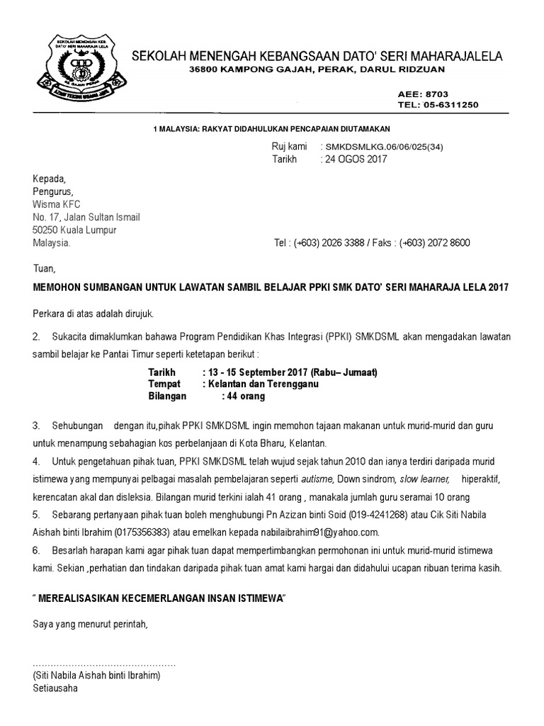 .contoh surat mohon sumbangan penajaan lawatan samb. Download as docx, pdf, txt or read online from scribd. Terdapat 312 penyuplai surat mohon bantuan, sebagian besar berlokasi di asia. Savesave contoh surat memohon tajaan nestle for later. 66361916 contoh surat mohon sumbangan. Sahabat 99, sudahkah lihat contoh surat jual beli tanah dalam artikel ini? Surat kiriman rasmi sebab tidak hadir. Zainal rahim berkata, jpa memperkenalkan program penajaan 9a+. Begitu juga di hari sukan selalunya pihak sekolah akan memohon tajaan dari syarikat minuman seperti nestle milo 100 plus dan sebagainya. Contoh surat panggilan mesyuarat panitia. Begitu juga di hari sukan, selalunya pihak sekolah akan memohon tajaan dari syarikat minuman seperti nestle, milo, 100 plus dan sebagainya. Pelajar yang mendapat tajaan perlu mengemukakan surat tawaran tajaan di bahagian pengurusan kewangan pelajar, jabatan bendahari, aras 3 bangunan canselor. Surat permohonan bantuan adalah jenis surat memohon bantuan samada kewangan,pendidikan,dana perniagaan,rumah dan biasiswa dari sesebuah organisasi,agensi dan individu.
